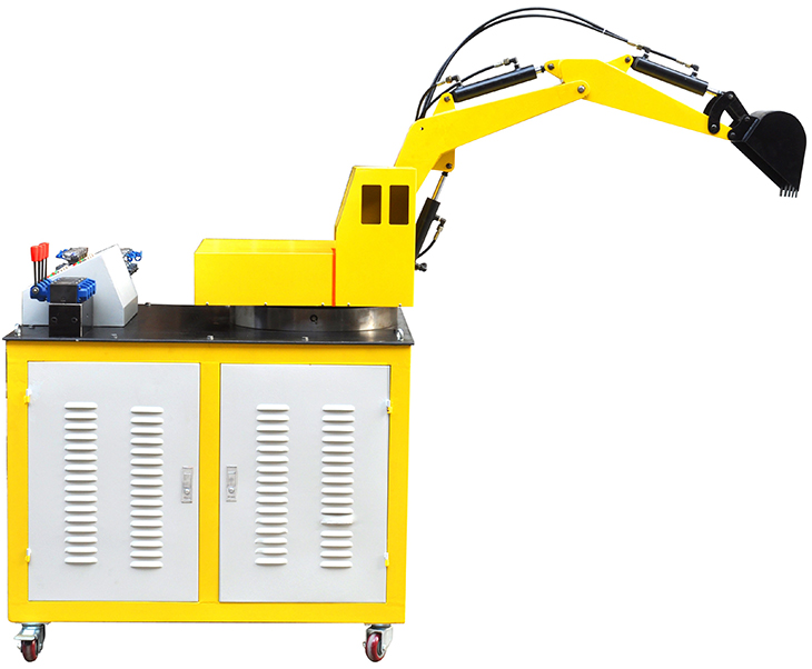 工業(yè)型挖掘機液壓實訓臺能模擬真實挖掘機工作裝置和回轉機構的各種動作,最高工作壓力可達7MPa,實訓臺由液壓挖掘機工作裝置、回轉機構、液壓傳動系統(tǒng)、電器控制器件、可編程控制器(PLC)和實訓桌組成,可實現(xiàn)挖掘、提升、回轉、卸料等典型動作。其中,液壓傳動系統(tǒng)配備手動、PLC控制兩種方式,分別由四組手動換向閥和電磁換向閥實現(xiàn)。通過操控本實訓臺,學生可以清晰地了解單斗液壓挖掘機的液壓元件組成、液壓回路工作原理、典型動作控制方式和機械結構。