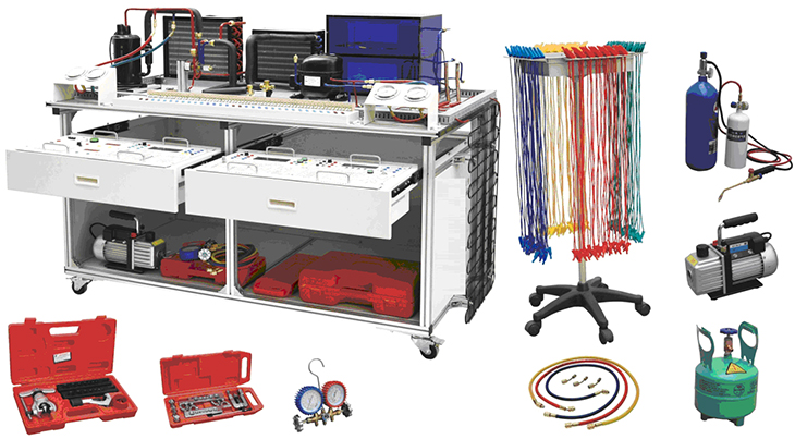 1、實(shí)訓(xùn)臺(tái)采用鋁型材臺(tái)架加實(shí)訓(xùn)模塊結(jié)構(gòu),裝置采用一體化設(shè)計(jì),由導(dǎo)軌式鋁合金安裝平臺(tái)、空調(diào)系統(tǒng)、電冰箱系統(tǒng)、電氣控制系統(tǒng)等組成。底部安裝有四個(gè)帶剎車(chē)的腳輪,可以方便的移動(dòng)和固定。設(shè)備配置空調(diào)制冷系統(tǒng)管路1套、直冷電冰箱制冷系統(tǒng)管路1套、安全插端子排,壓力表(1.5MPa)2只(3.5 MPa)2只等。