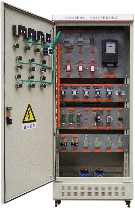 初級(jí)電工電拖實(shí)訓(xùn)考核裝置,初級(jí)電工考核柜,初級(jí)電工實(shí)訓(xùn)考核裝置是按照勞動(dòng)社會(huì)保障部頒發(fā)的“工人技術(shù)等級(jí)標(biāo)準(zhǔn)”和“職業(yè)技能鑒定規(guī)范”的內(nèi)容要求,根據(jù)初級(jí)電工培訓(xùn)考核的實(shí)際情況而設(shè)計(jì)的新一代集培訓(xùn)學(xué)習(xí)、理論驗(yàn)證、實(shí)際操作能力、考核鑒定于一體的多功能柜式設(shè)備。整臺(tái)設(shè)備以標(biāo)準(zhǔn)的電氣控制柜為主柜,利用柜體的雙面空間,布置電器 及配套實(shí)驗(yàn)器材,能完成初級(jí)電工考核鑒定中的電力拖動(dòng)控制與照明電路的實(shí)操項(xiàng)目,該電工、電拖實(shí)訓(xùn)考核裝置堅(jiān)持理論聯(lián)系實(shí)際的原則,突出技能訓(xùn)練,注重針對(duì)性、實(shí)用性、科學(xué)性,經(jīng)全國(guó)多家職業(yè)技能訓(xùn)練中心、職校、技校使用證明,該柜體設(shè)計(jì)合理、實(shí)操方便,占地面積少。為延長(zhǎng)電器的使用壽命,各電器的接點(diǎn)都與接線端子相連,再讓學(xué)生在接線端子上接線,連接電機(jī)、電器來完成各項(xiàng)控制實(shí)驗(yàn),有效降低材料消耗,延長(zhǎng)使用壽命。該套設(shè)備適用于各勞動(dòng)職業(yè)技能鑒定部門,同時(shí)適應(yīng)各大、中專、技校、職校初級(jí)電工、電拖專業(yè)教學(xué)與實(shí)訓(xùn)考核。