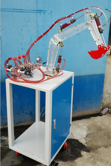 實(shí)訓(xùn)臺主要由底柜,透明大臂,透明斗桿,透明挖斗(紅色),透明油缸,透明集成閥島,透明手動換向閥,透明電磁閥,旋缸馬達(dá),減速器等成