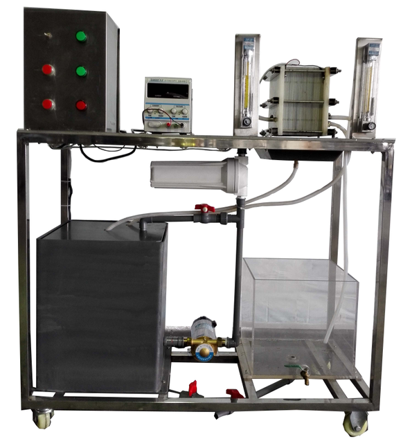 有機(jī)玻璃外箱體、電滲析器、直流穩(wěn)壓電源、配水箱、進(jìn)水泵、流量計、壓力表、不銹鋼框架、控制屏。