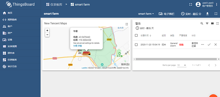 圖:智慧牧場(chǎng)課程案例,使用GPS對(duì)奶牛位置進(jìn)行定位,通過LoRa網(wǎng)絡(luò)將位置信息上報(bào),使用ThingsBoard平臺(tái)的電子圍欄工具結(jié)合騰訊地圖,實(shí)現(xiàn)奶牛越過電子圍欄時(shí)發(fā)送警報(bào)提醒。