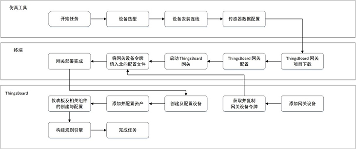 模擬智慧牧場(chǎng)系統(tǒng)還引入使用開源軟件平臺(tái)ChirpStack與ThingsBoard,結(jié)合LPWAN技術(shù),實(shí)現(xiàn)遠(yuǎn)程低功耗數(shù)據(jù)采集、上報(bào)和展示。在ChirpStack平臺(tái)上,用戶可對(duì)網(wǎng)關(guān)、GPS、溫濕度傳感器等設(shè)備進(jìn)行配置,以上送仿真實(shí)驗(yàn)中的虛擬數(shù)據(jù)。在ThingsBoard平臺(tái)上,設(shè)置牧場(chǎng)地圖、告警信息、溫濕度等各儀表盤組件;獲取仿真設(shè)備上送的數(shù)據(jù),并將數(shù)據(jù)以圖表形式作可視化呈現(xiàn);以及基于流式編程添加相應(yīng)的規(guī)則策略,最終完成模擬智慧牧場(chǎng)實(shí)訓(xùn)場(chǎng)景的部署搭建。