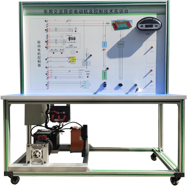 檢測(cè)控制面板(裝有各種檢測(cè)端子,1448×940mm彩色電路圖和工作原理示意圖)、組合儀表、點(diǎn)火開關(guān)、電機(jī)控制器、車載充電器與充電接口、DC-DC轉(zhuǎn)換器、鋰動(dòng)力電池組、電動(dòng)車電機(jī)(交流異步電動(dòng)機(jī))、剎車開關(guān)、檔位開關(guān)、油門控制裝置、大電流繼電器、電源總開關(guān)、急停開關(guān)、輔助蓄電池(12V45AH)、一體化全鋁合金型材搭建的移動(dòng)臺(tái)架(1500×700×1700mm (帶自鎖腳輪裝置,帶安裝檢測(cè)端子的原理面板,面板1448×940mm)、設(shè)備操作說(shuō)明書。
