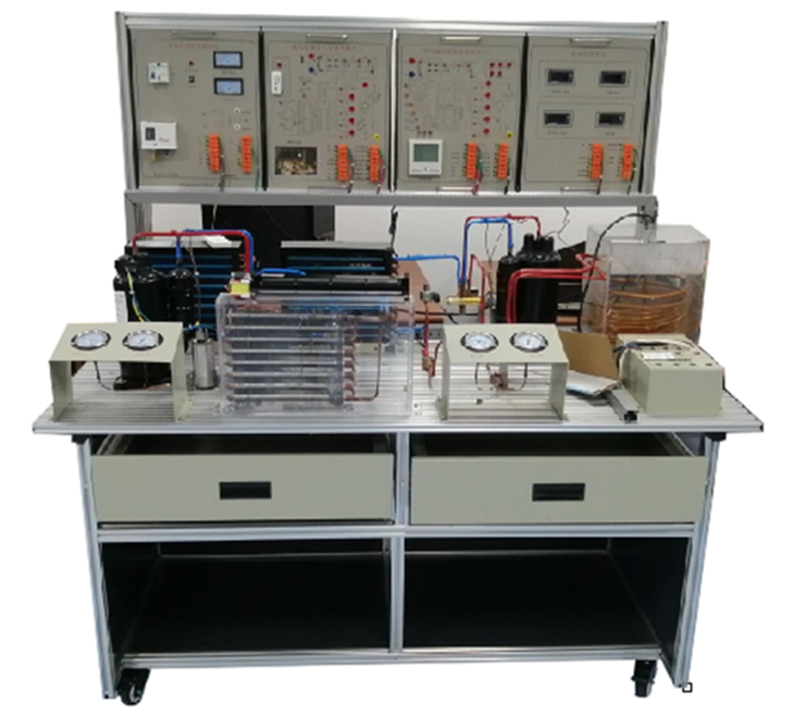 實訓(xùn)桌采用工業(yè)標準鋁型材件與鈑金結(jié)構(gòu)件拼裝而成,結(jié)構(gòu)堅固,造形美觀大方;設(shè)有二個大抽屜,用于放置實訓(xùn)導(dǎo)線或工具等。實訓(xùn)桌臺面用于放置熱泵型家用空調(diào)和空氣源熱泵系統(tǒng)的元器件并提供一個寬敞舒適的工作臺面,學(xué)生可以在工作臺面上將制冷系統(tǒng)的器件任意安裝,實訓(xùn)桌還設(shè)有四個萬向輪,便于移動和固