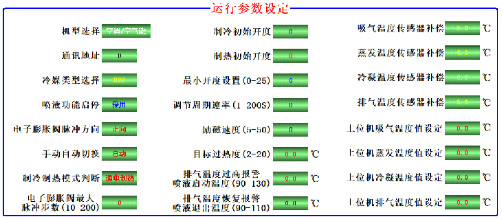 11)、顯示界面上29 路參數(shù)控制參數(shù)設(shè)置/查詢:控制器內(nèi)所有與控制相關(guān)的溫度參數(shù)、時間參數(shù)、控制參數(shù)、等29個參數(shù)都可以調(diào)整,以適應(yīng)制冷/熱泵/冷庫/水機等設(shè)備。