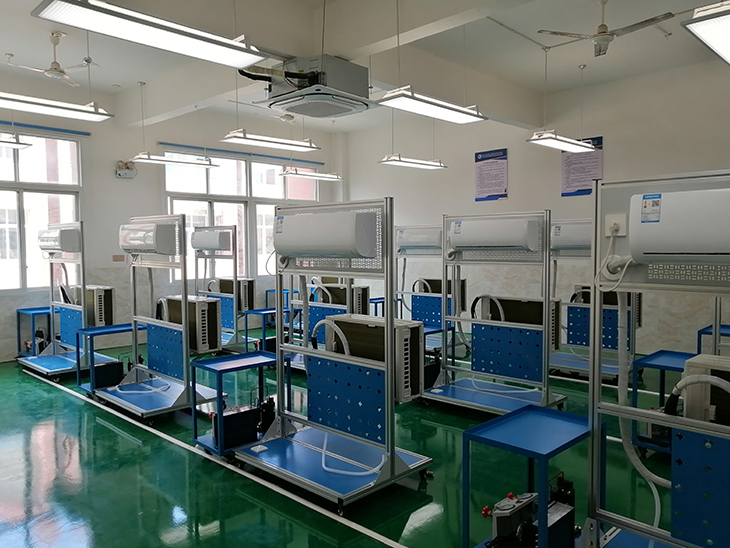 制冷與暖通實(shí)訓(xùn)室、水暖與空調(diào)實(shí)訓(xùn)室主要配備暖通技術(shù)實(shí)訓(xùn)臺(tái)、中央空調(diào)綜合實(shí)訓(xùn)裝置、中央空調(diào)微機(jī)控制實(shí)驗(yàn)臺(tái)、供暖系統(tǒng)實(shí)訓(xùn)設(shè)備、空調(diào)、制冷、換熱綜合實(shí)驗(yàn)臺(tái)、循環(huán)式空調(diào)過(guò)程實(shí)驗(yàn)裝置、熱離心泵特性曲線(xiàn)測(cè)定實(shí)驗(yàn)臺(tái)、水離心泵綜合試驗(yàn)臺(tái)、采暖模擬訓(xùn)練系統(tǒng)、制空氣源熱泵熱機(jī)實(shí)訓(xùn)考核裝置、冷空調(diào)設(shè)備實(shí)訓(xùn)臺(tái)、空調(diào)技術(shù)實(shí)訓(xùn)臺(tái)、暖通技術(shù)實(shí)訓(xùn)室以暖通空調(diào)設(shè)備為主,滿(mǎn)足暖通空調(diào)專(zhuān)業(yè)相關(guān)的實(shí)訓(xùn)實(shí)驗(yàn)操作、材料設(shè)備的展示、設(shè)備系統(tǒng)安裝展示、運(yùn)行展示及現(xiàn)場(chǎng)教學(xué)等功能;制冷空調(diào)設(shè)備實(shí)訓(xùn)室以冰箱、分體式空調(diào)器拆裝、移機(jī)、調(diào)試、故障模擬與排除等項(xiàng)目為教學(xué)內(nèi)容,重在培養(yǎng)學(xué)生對(duì)電冰箱和空調(diào)器制冷系統(tǒng)故障診斷和維修能力和空調(diào)安裝能力,同時(shí)進(jìn)行“制冷空調(diào)系統(tǒng)安裝維修工”的職業(yè)技能的考核和鑒定,可為校內(nèi)、校外培訓(xùn)相應(yīng)的中級(jí)和高級(jí)工;空調(diào)技術(shù)實(shí)訓(xùn)室以家用多聯(lián)機(jī)空調(diào)系統(tǒng)設(shè)備安裝、設(shè)備檢修為教學(xué)內(nèi)容,兼顧熱水采暖系統(tǒng)安裝、給排水管路制作實(shí)訓(xùn)操作等。重在培養(yǎng)學(xué)生對(duì)多聯(lián)機(jī)空調(diào)系統(tǒng)的安裝和故障診斷和維修能力,同時(shí)進(jìn)行“制冷空調(diào)系統(tǒng)安裝維修工”的職業(yè)技能的考核和鑒定等;制冷技術(shù)實(shí)訓(xùn)室主要有裝配式冷庫(kù)、現(xiàn)代冷庫(kù)技術(shù)綜合實(shí)訓(xùn)考核設(shè)備、凍干機(jī)等設(shè)備。暖通空調(diào)實(shí)訓(xùn)室設(shè)備主要培養(yǎng)學(xué)生對(duì)典型食品冷加工設(shè)備的拆裝維修能力;冷藏庫(kù)的調(diào)試、運(yùn)行維護(hù)及其排除故障的能力;冷庫(kù)制冷工藝設(shè)計(jì)能力。并對(duì)學(xué)生進(jìn)行“制冷空調(diào)系統(tǒng)安裝維修工”職業(yè)技能考核鑒定,同時(shí)具備制冷與空調(diào)專(zhuān)業(yè)行業(yè)技能大賽訓(xùn)練的條件。